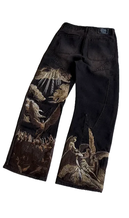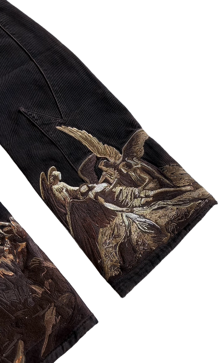 Crafted from heavyweight premium cotton, these black jeans feature intricate golden angel embroidery inspired by divine artwork. Every detail — from the raised thread texture to the rich contrast of gold and brown tones — reflects exceptional craftsmanship and timeless luxury.
