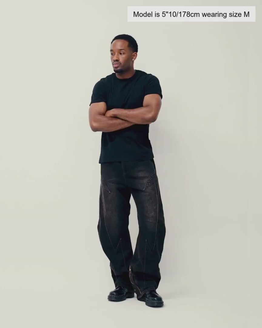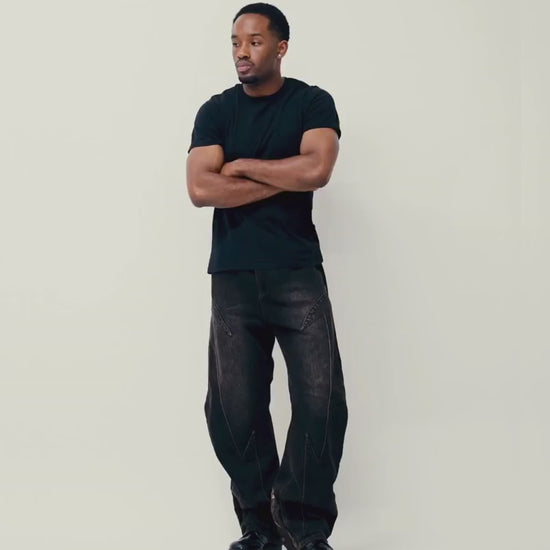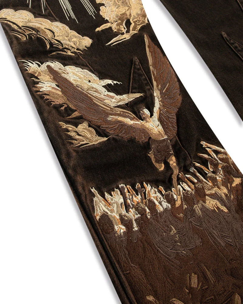 Crafted from heavyweight premium cotton, these black jeans feature intricate golden angel embroidery inspired by divine artwork. Every detail — from the raised thread texture to the rich contrast of gold and brown tones — reflects exceptional craftsmanship and timeless luxury.